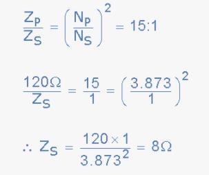 音频变压器阻抗比其中 Z P是初级绕组阻抗,Z S是次级绕组阻抗,(N P /N S ) 是变压器匝数比,(V P /V S ) 是变压器电压比。例如,阻抗匹配音频变压器的匝数比(或电压比)为 2:1,其阻抗比为 4:1。音频变压器示例 No1需要使用阻抗比为 15:1 的音频变压器来匹配功率放大器的输出和扬声器。如果放大器的输出阻抗为 120Ω。计算功率传输所需的扬声器的标称阻抗。
