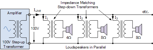 阻抗匹配示例然后功率放大器可以有效地驱动8欧姆扬声器。音频 100V 线路变压器另一种非常常见的阻抗匹配应用是用于 100 伏线路变压器,用于通过公共广播扩音系统传输音乐和语音。这些类型的天花板扬声器系统使用距离功率放大器一定距离的多个扬声器。通过使用线路隔离变压器,可以将任意数量的低阻抗扬声器连接在一起,以便它们正确地加载放大器,从而在放大器(源)和扬声器(负载)之间提供阻抗匹配,实现功率传输。由于对于给定的电缆电阻,信号通过扬声器电缆的功率损耗与电流的平方 (P = I 2 R) 成正比,因此用于公共广播 (PA) 或扩音器的放大器的输出电压使用标准恒定电压输出电平,即峰值 100 伏 (均方根 70.7 伏)。例如,驱动 8 欧姆扬声器的 200 瓦功放提供 5 安培电流,而使用 100 伏线 瓦功放全功率时仅提供 2 安培电流,因此可以使用较小规格的电缆。但请注意,只有当驱动线路的功率放大器以全额定功率运行时,线 伏电压,否则功率(音量较低)和线路电压会降低。因此,对于 100V(70.7V rms)线路扬声器系统,线路变压器将音频输出信号电压升压至 100 伏,以便给定功率输出的传输线电流相对较低,从而减少信号损耗,从而允许使用直径或规格较小的电缆。由于典型扬声器的阻抗通常较低,因此每个连接到 100V 线路的扬声器都使用一个阻抗匹配降压变压器(通常称为线到音圈变压器),如图所示。100V 输电线路变压器
